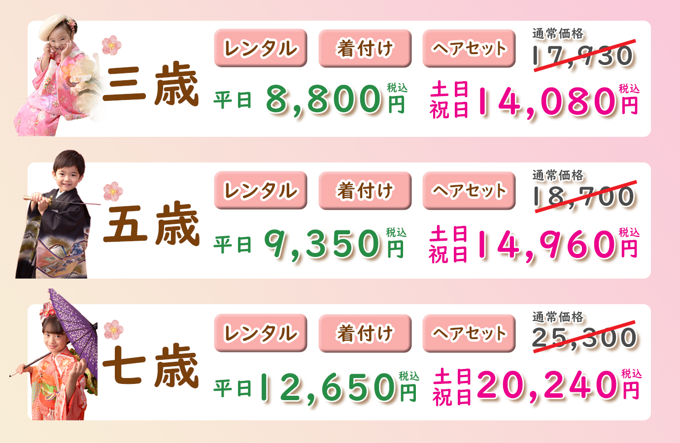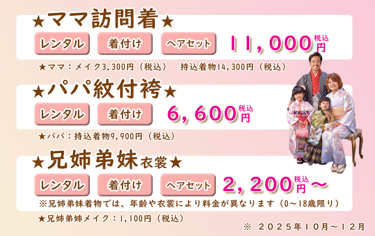 ご家族撮影は無料です。さらにご希望のポーズ(ご兄弟、お母様とお子様の2ショット等)がございましたらご相談ください。